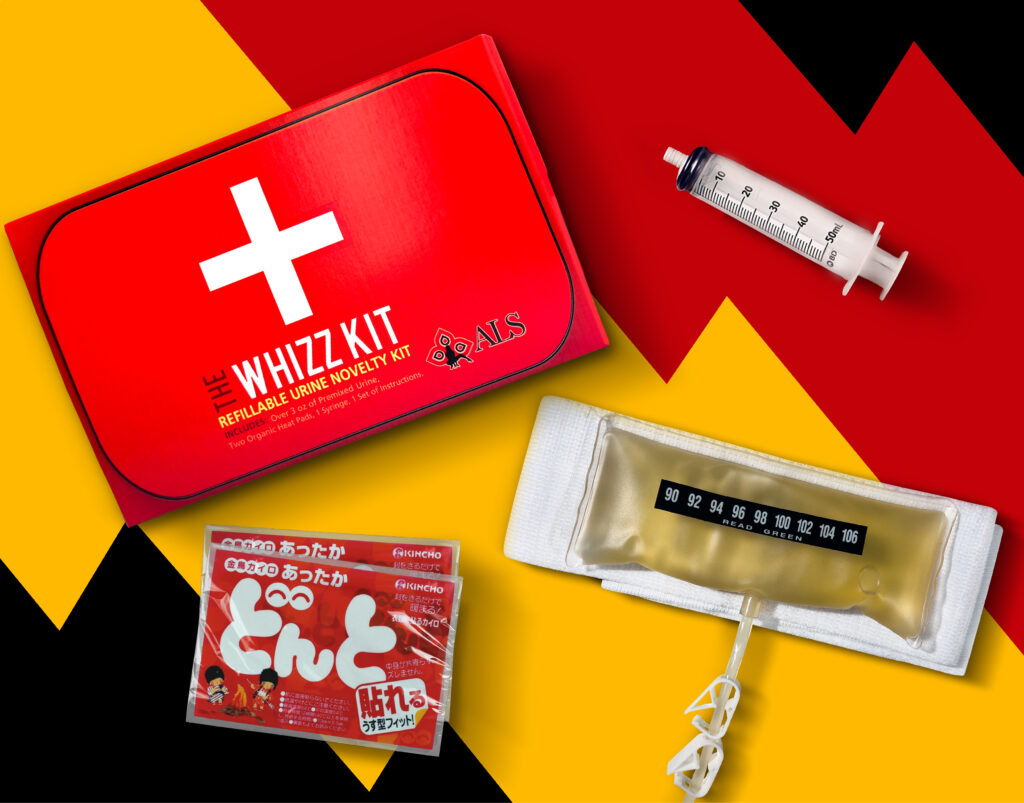 Whizzinator is a wearable prop designed to look like body parts and dispense synthetic urine. This substance mimics real urine in many respects, including acid levels and thickness, making it hard for testers to tell whether or not it is real or fake.